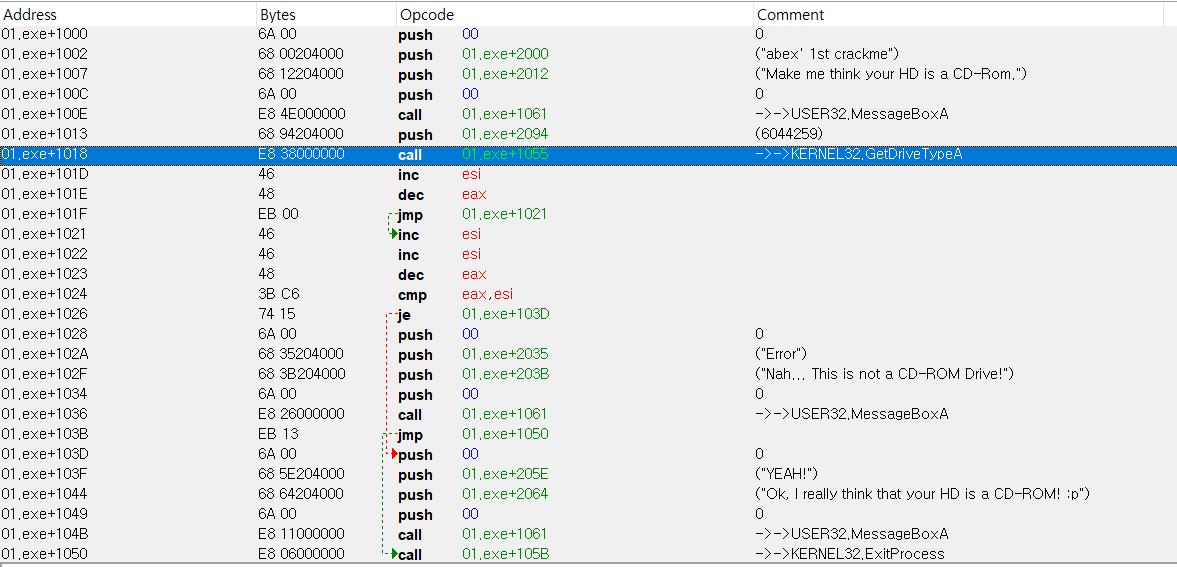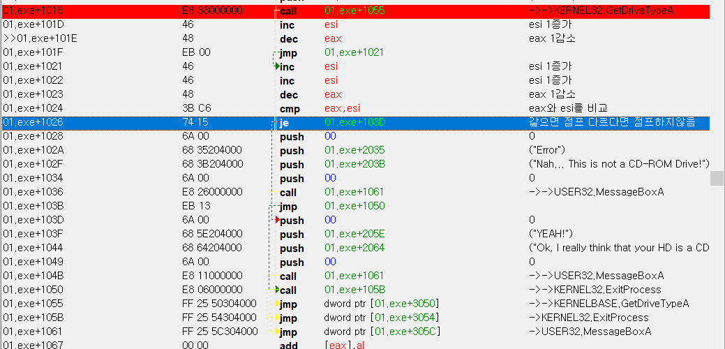 해당 Return 되는 값을 봤을떄 GetDriveTypeA 함수는 CD-ROM일시 5를 반환한다는걸 알수있습니다.