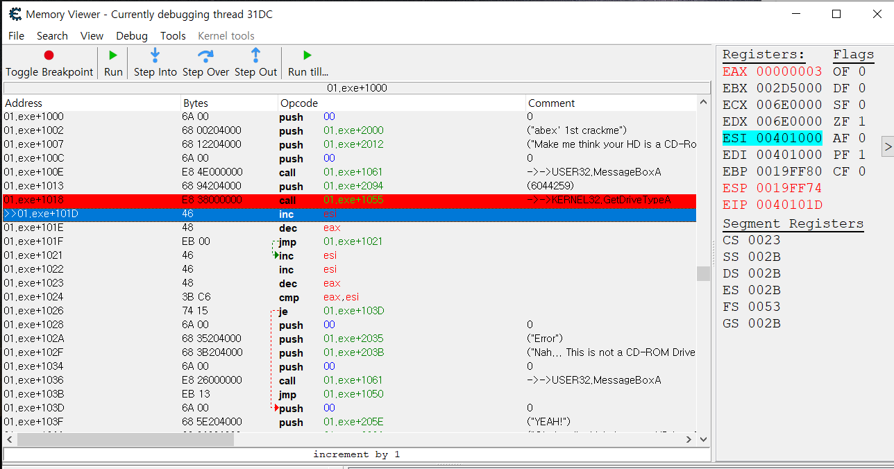 GetDriveTypeA에 BreakPoint(중단점)을 걸고 다음 단계로 넘어가봅시다.