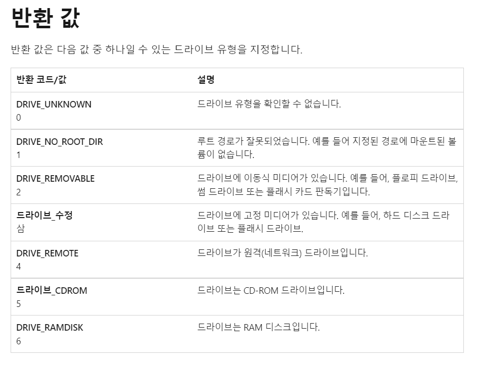 우선 GetDriveTypeA 의 리턴값이 어떻게 반환되는지 확인하기 위하여 구글에서 해당 함수를 검색해봅니다.