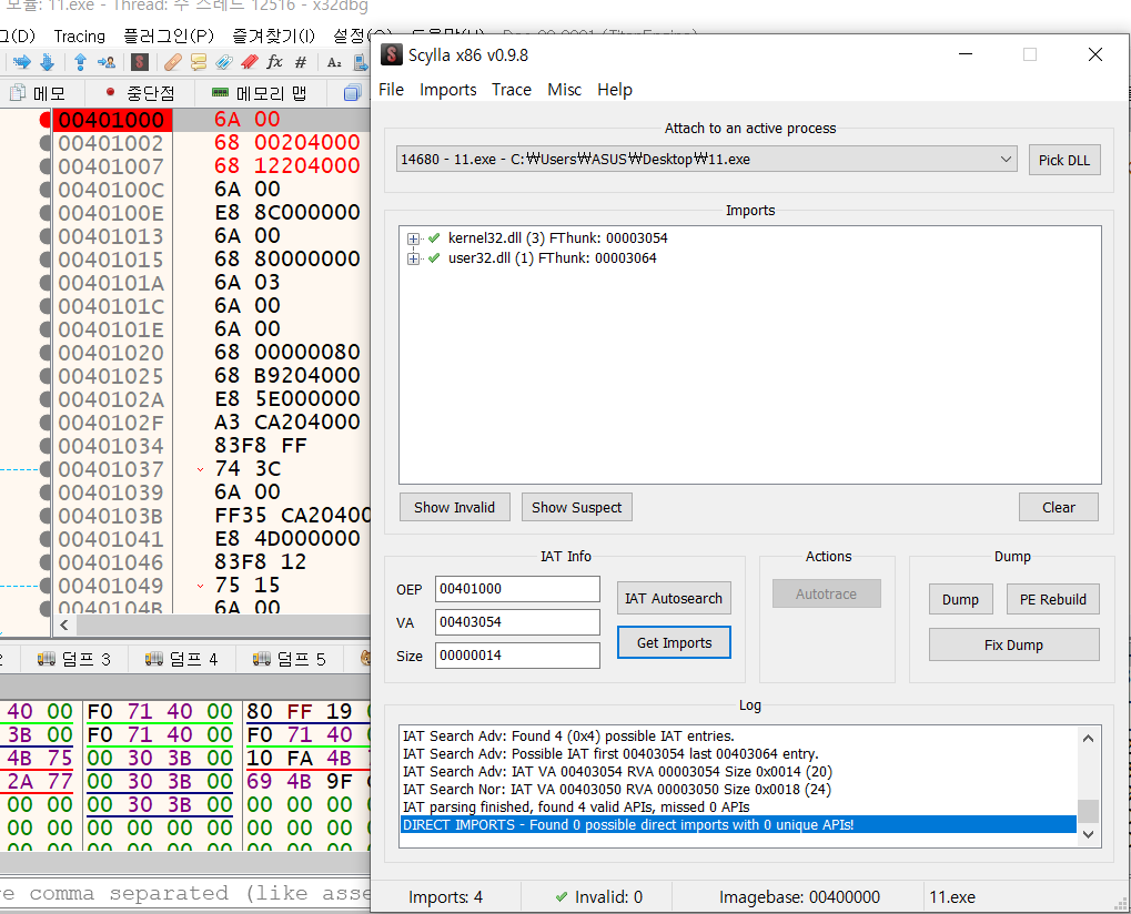 후에 00401000 주소로 OEP를 재설정후 덤프를 해줬습니다.