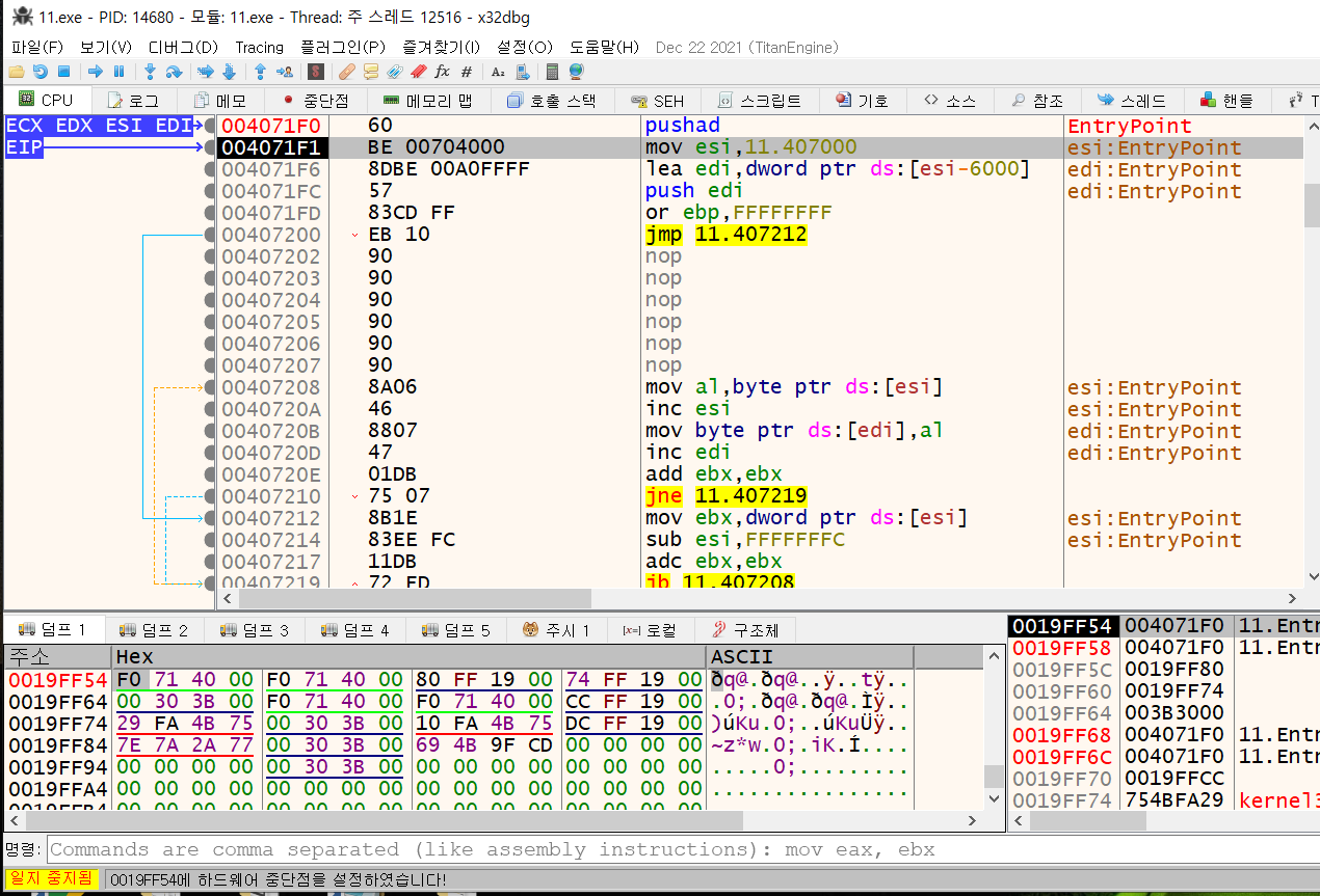 OEP 주소로 이동하기위해 ESP 주소에 중단점을 걸어줬습니다.