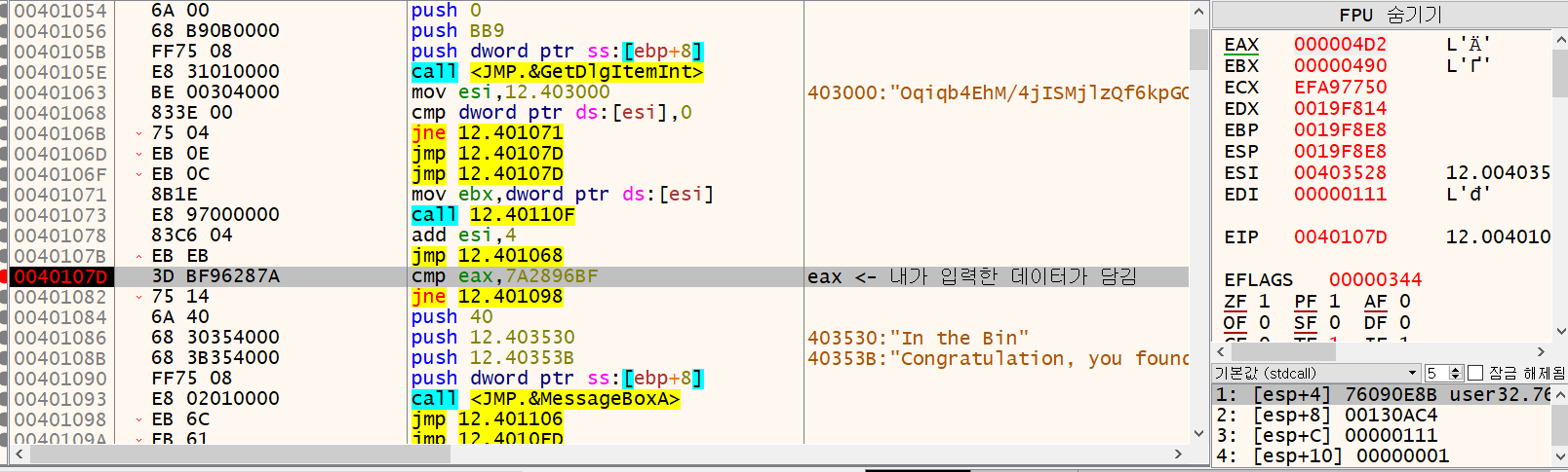 eax에 어떤 데이터가 들어가는지 BreakPoint(중단점)을 걸고 확인하면