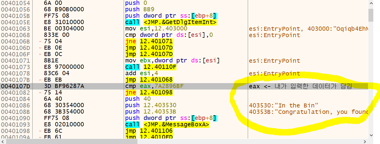 바로 위에 eax값이 7A2896BF 인지 확인후 성공 메세지가 출력되는지 분기가 갈리는 코드가 있습니다.