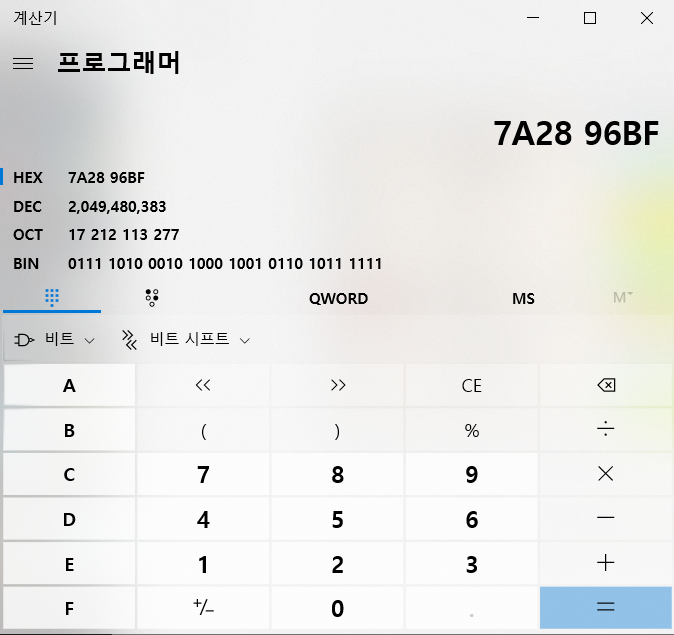 7A2896BF를 10진수로 변환하면 2049480383 이 됩니다.