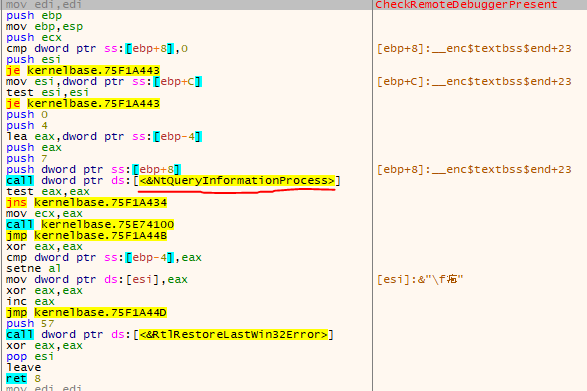 CheckRemoteDebuggerPresent() 함수는 ProcessDebugPort (7) 로 NtQueryInformationProcess() 함수에 전달한다.