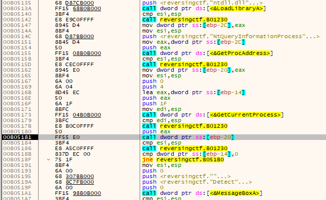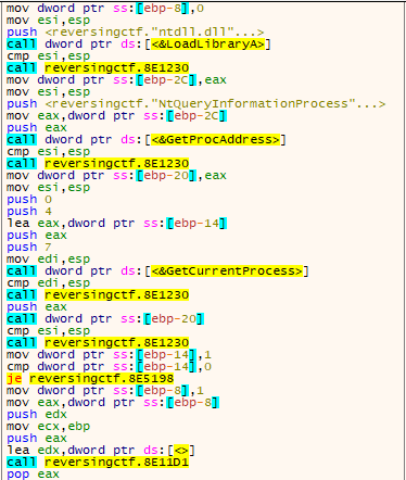 pNtQueryInformationProcess(GetCurrentProcess(), ProcessDebugFlags, &DebugFlag, 4, 0);