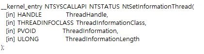 NtSetInformationThread는 ZwSetInformationThread 의 wrapper function이며,