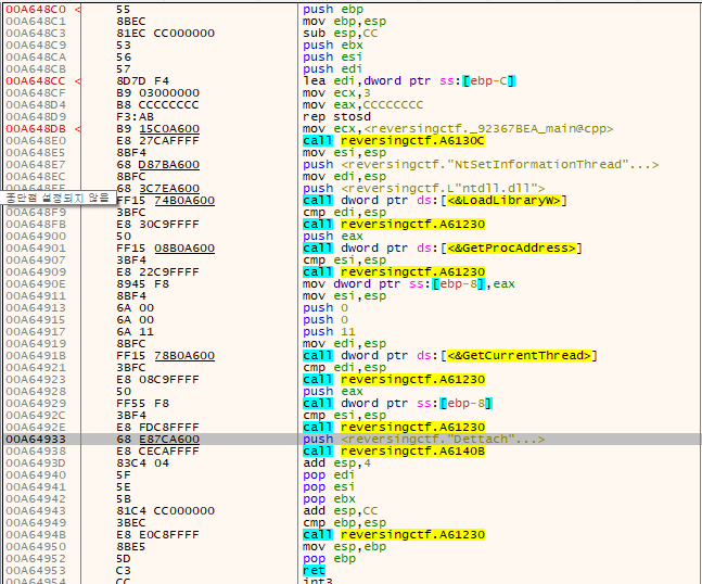 NtSetInformationThread(GetCurrentThread(),ThreadHideFromDebugger,0,0)가 호출된다.