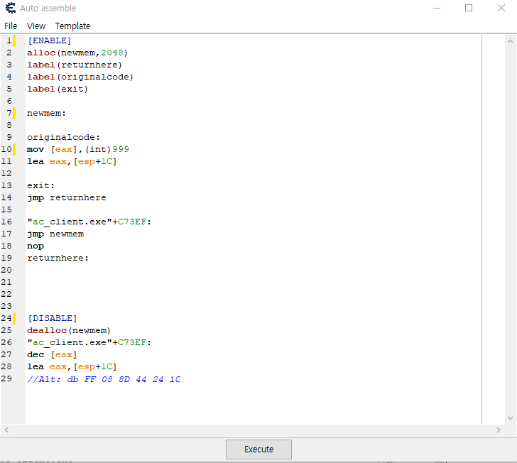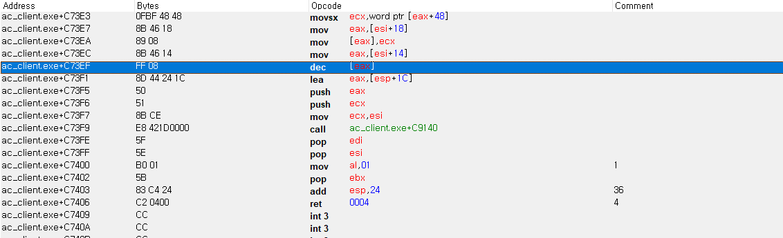 해당 ac_client.exe+C73EF 주소 영역이 총알 감소를 담당하는 Function인 것을 알아냈고