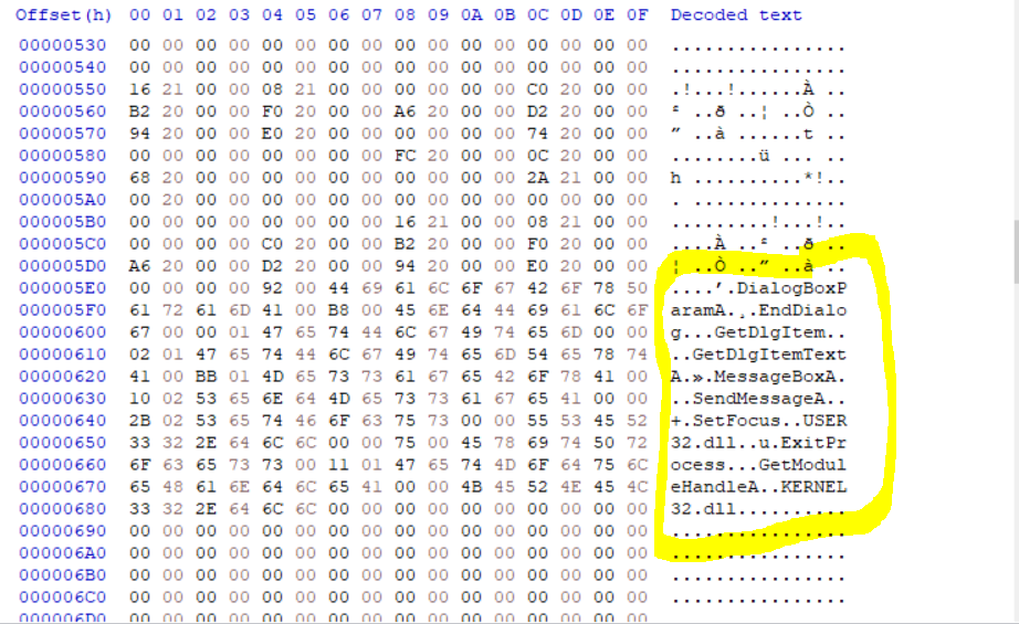 해당 메모리주소에서 메세지박스 내용으로 추측되는 문자열이 있습니다.