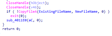 또한 CopyFileA 로 특정 파일을 복사하는 작업도 수행하는 것 같다.