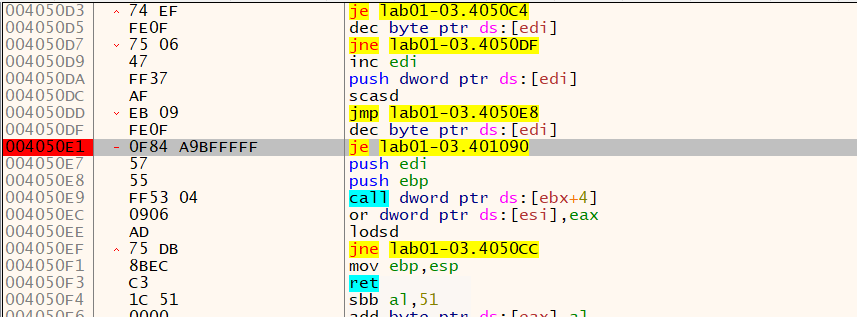 EP 주소에서 하단으로 내리면 je 0x401090 명령어를 확인할 수 있다.