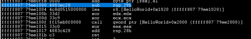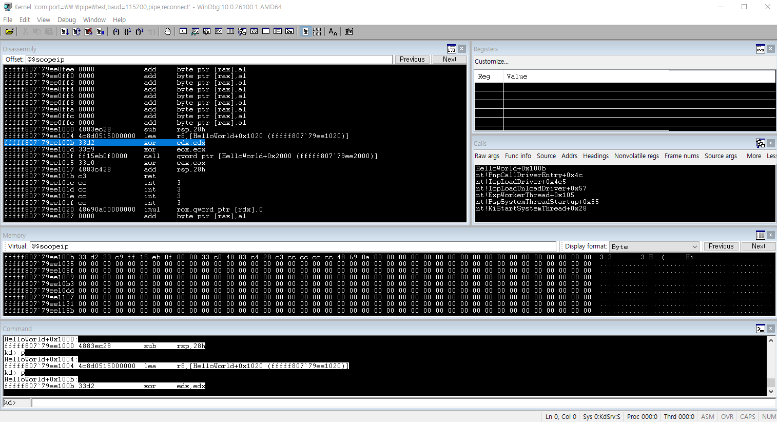 제작한 HelloWorld.sys의 DriverEntry 실행까지 도달한 모습을 확인할 수 있다.