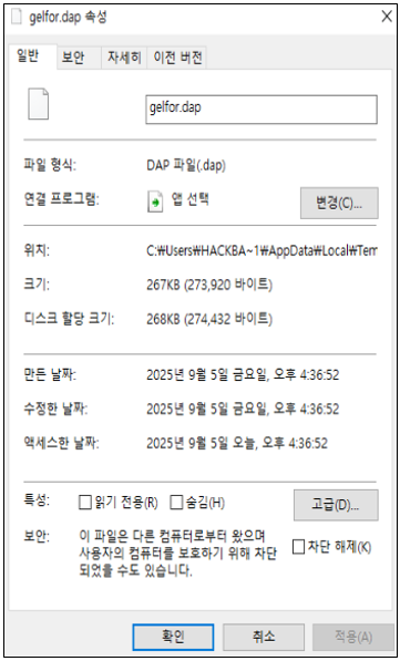 특히 "BNJAFSRSQIX"라는 실행 인수를 이용하여 rundll32.exe를 통해 gelforr.dap DLL을 로드하는 방식으로 악성 동작을 수행하는 것으로 관찰되었다.