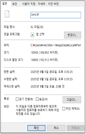 VBA 매크로가 실행되면 (그림 5)와 같이 객체가 "zoro.kl" 파일로 드롭된다. 해당 파일은 매크로 코드에서 추가로 실행되는 두 번째 단계의 Word 문서이며, 그 동작 방식을 확인하기 위해 다음 VBA 매크로의 세부 동작을 분석한다.