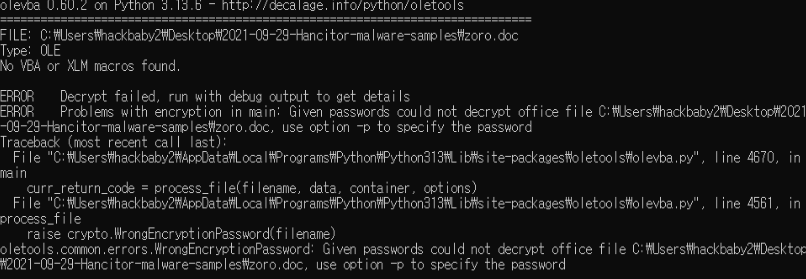 "zoro.kl" 파일을 "zoro.doc"로 이름을 변경한 후, olevba 도구를 이용하여 덤프 작업을 수행하였으나 첫 번째 문서와 달리 해당 파일에는 암호가 설정되어 있어 에러 메시지가 출력된다.