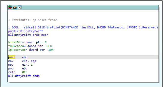 일반적으로 DllMain(DllEntryPoint) 함수는 DLL 파일의 진입점으로 DLL이 로드될 때 초기화 작업이나 주요 기능을 수행하는 역할을 한다. 하지만 HANCITOR의 경우 DllEntryPoint는 단순히 1을 반환하는 것 외에는 아무 동작도 수행하지 않는다. 즉 DLL이 단순히 로드되는 것만으로는 행위가 발생하지 않으며 rundll32.exe 같은 프로세스를 통해 특정 Export 이름 (BNJAFSRSQIX)을 실행인수로 호출될 때에만 트리거가 발동 된다.