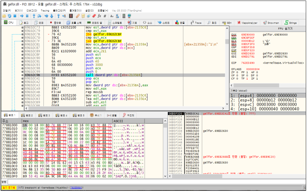 코드 크기가 상당히 크기 때문에 VirtualAlloc 함수에서 브레이크포인트에 도달하기까지 약 30초 정도의 시간이 소요된다.