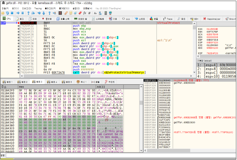 VirtualAlloc 호출을 추적하던 중, 세 번째 호출 시점의 할당된 메모리 영역에서 MZ 헤더(Signature)를 나타나는 data가 복사 된 걸 확인할 수 있었다.