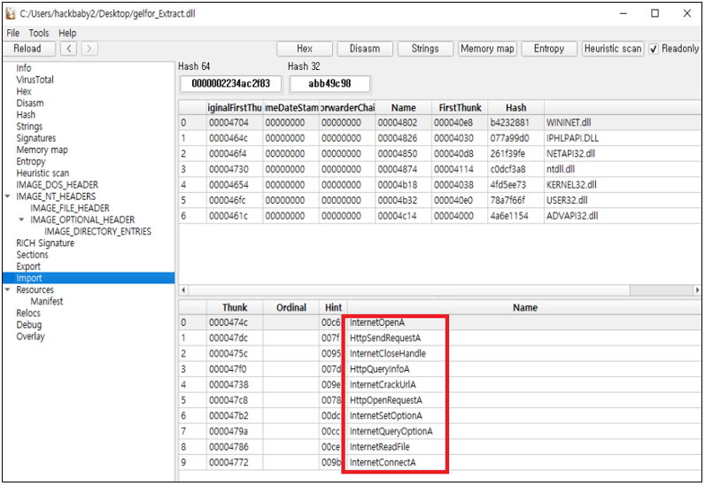 이후 추출한 바이너리를 확인해보면 네트워크 활동에 사용되는 주요 API들이 Import Table에 노출되어 있는 것을 확인할 수 있다.