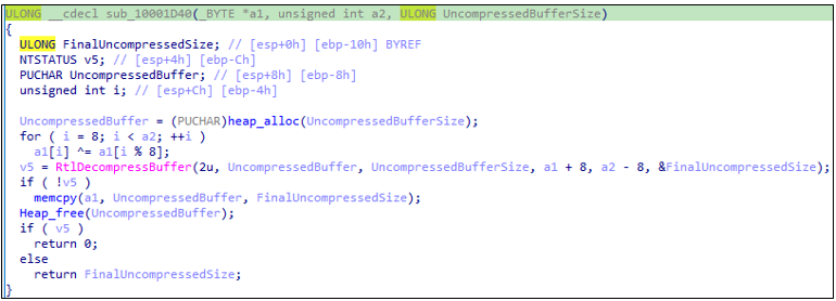 XOR 복호화가 완료되면 RtlDecompressBuffer()를 호출하여 파일의 압축을 해제한다.