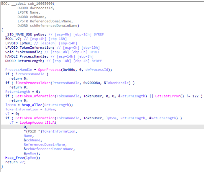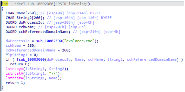 sub_10003000() 루틴에서는 OpenProcess(PROCESS_QUERY_INFORMATION)를 호출한다. 일반적으로 Explorer는 사용자 세션과 함께 실행되므로, 이 과정을 통해 로그인한 사용자의 컨텍스트를 추출하려는 목적임을 유추할 수 있다. 마지막으로 LookupAccountSidA()를 사용하여 현재 로그인한 사용자 계정 이름과 도메인 이름을 획득한다. 이 과정을 거치면 다음과 같은 형식의 문자열을 완성한다: