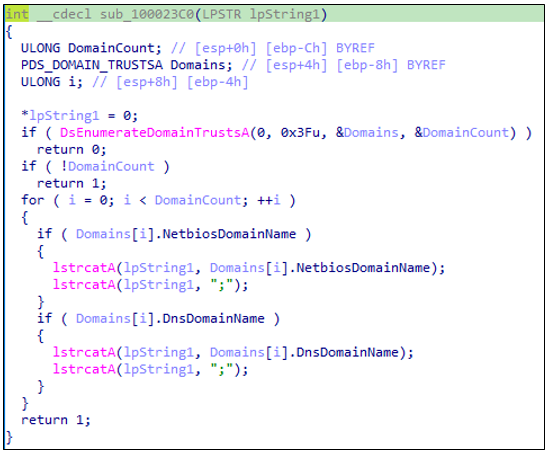 DsEnumerateDomainTrustsA()를 호출하여 지정된 도메인에 대한 신뢰 도메인 목록을 가져오고 모든 도메인의 NetBIOS 이름과 DNS 이름을 세미콜론으로 이어붙여서 lpString1에 반환한다.