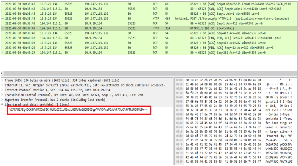 샘플 실행 과정에서 수집된 pcap 네트워크 트래픽을 확인한 결과, HANCITOR가 전송한 피해자 정보 전송에 대해 C2 서버가 아래와 같은 응답을 반환하는 것을 확인할 수 있었다