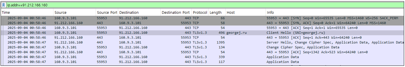 수집한 pcap 로그를 분석한 결과, data.bin 실행 로직 이후 분석 대상 호스트에서 원격 명령제어(C2)로 추정되는 91.212.166.160:443 (HTTPS) 연결이 발생한 것을 확인했다. 해당 연결은 C2 서버로부터 추가적인 명령·데이터 수신이 가능한 상태임을 의미한다.