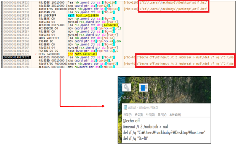 모든 정보 탈취 및 전송 작업이 완료되면, 자가 삭제 루틴을 수행한다. util.bat 스크립트를 생성하고 일정 시간이 지난 후 악성 실행 파일(host.exe), 생성한 자가 삭제 스크립트(util.bat)까지 제거하도록 설계되어 있다.