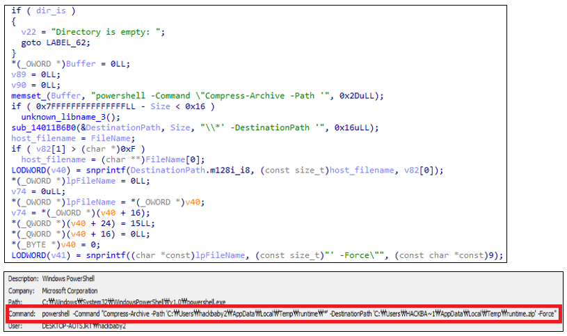 탈취 기능 수행이 모두 완료되면, 악성코드는 수집된 데이터가 정상적으로 생성 및 기록되었는지 확인한 후 PowerShell 명령을 통해 결과물을 압축한다. 사용되는 명령은 다음과 같다.