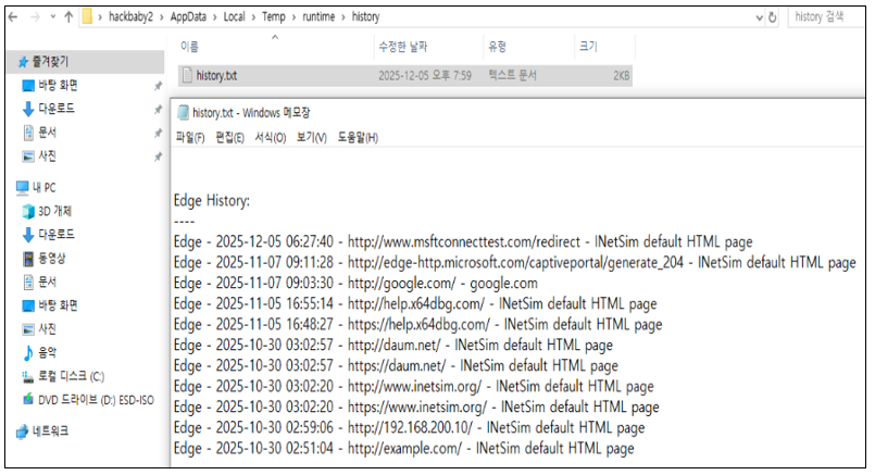 history.txt 파일 내용을 확인한 결과, 각 브라우저별로 방문 기록이 분류되어 저장되어 있음을 확인하였다.