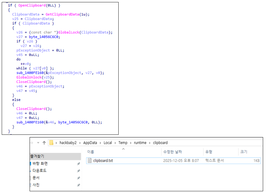 Clipboard 수집 루틴은 C:\Users\ **** \AppData\Local\Temp\runtime 경로 하위에 clipboard 디렉터리를 생성하고, clipboard.txt 파일에 탈취한 클립보드 데이터를 기록한다. 이를 위해 OpenClipboard() 함수를 사용하여 현재 사용자 클립보드에 저장된 문자열 정보를 가져온다.