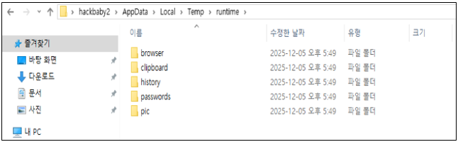 History 수집 루틴은 C:\Users\ **** \AppData\Local\Temp\runtime 경로 하위에 history 디렉터리를 생성한 뒤, history.txt 파일을 생성하여 브라우저 방문 기록을 수집 및 저장한다.
