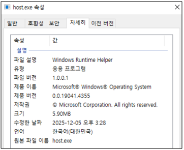 분석 결과, Windows 환경을 대상으로 제작된 64비트 실행 파일이며 C/C++ 기반으로 구현된 인포스틸러임을 확인할 수 있다. 또한 파일 리소스 메타데이터를 조사한 결과, 제품명과 설명을 Windows Runtime Helper 로 지정하고 저작권(Copyright)을 Microsoft Corporation으로 위조하여 정상 윈도우 구성 요소로 위장하고 있었다.
