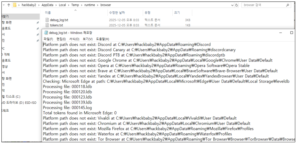 브라우저 탐색 과정에서 성공적으로 발견된 브라우저와 미발견된 브라우저에 대한 로그는 debug_log.txt 파일에 기록되며, 탈취에 성공한 토큰은 tokens.txt에 저장된다.
